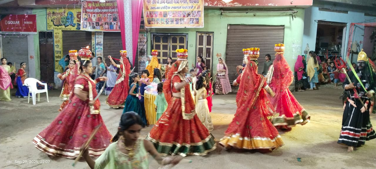 जय श्री अंबे गरबा मंडल में, नो दिवसीय गरबे में ,सातवे दिन गरबा प्रारम्भ होने से पूर्व ,मातारानी जी की महाआरती की गई! उसके बाद छोटी-छोटी बालिकाओं से गरबा प्रारंभ किया गया ! जिसमें सर्वप्रथम नो कन्याओ ने गरबा किया! उसके बाद महिला ने मां भवानी के अंतर्गत हाथ में (खड़क) तलवार लेकर, गरबे का प्रदर्शन शुरू किया ! इसमें कान्हा ग्रुप की महिलाएं हीरा सुथार, भाग्यलक्ष्मी, चंदा सुथार, मनीषा पुरबिया,कंचन पुरबिया, तमन्ना गोस्वामी,नीतू सुथार, सहित कान्हा ग्रुप / महिला मंडल का गरबे में बड़ा योगदान रहा! व काना ग्रुप/ महिला मंडल द्वारा गरबे में पारितोषित भी दिया गया, व पुरुषों द्वारा डांडिया रास गरबा प्रारंभ किया! इसमें विचित्र वेशभूषा में जाकियो का प्रदर्शन किया गया! व कालिका माता का भी प्रदर्शन हुआ! व गरबे की रौनक बढ़ाई उसके बाद महिलाओं द्वारा , रास गरबा, फिर डांडिया रास, उसके बाद तीन ताली, गरबा खेला गया, व गुजराती डांस किया गया !जिसमें कुछ भामाशाह द्वारा गरबे में पारितोषिक, भी वितरित किया गया! गरबे में जय श्री अंबे गरबा मंडल/काना ग्रुप/ महिला मंडल ,पुरुष का ग्रुप मौजूद रहा, सभी इसमें कार्यकर्ताओं द्वारा, संचालित गरबे का देख रेख किया गया! उसके पश्चात गरबे का समापन किया गया! जिंसमे दाड़म चंद पुछड़ी,राजेन्द्र शर्मा,भरत सुथार, रोशन सुथार,सुशील तेजावत, कैलाश पूर्बिया,हिम्मत पूर्बिया,वासु देव गोस्वामी,मनीष पूर्बिया,राहुल शर्मा,हित शर्मा, कमलेश, राहुल, सहित जय श्री अंबे गरबा मंडल के कार्यकर्ता मौजूद रहे! जिसमें मंच संचालन राजेंद्र शर्मा ,व भरत सुथार द्वारा किया गया