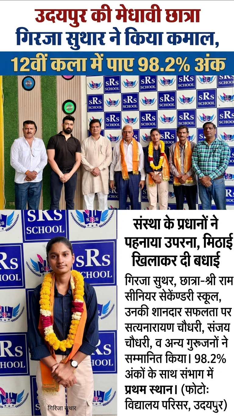 उदयपुर। राजस्थान माध्यमिक शिक्षा बोर्ड (RBSE) द्वारा घोषित 12वीं बोर्ड परीक्षा के परिणामों में झीलों की नगरी उदयपुर की गिरजा सुथार ने अपनी प्रतिभा का लोहा मनवाया है। शहर के प्रतिष्ठित श्री राम सीनियर सेकेंडरी स्कूल, आयड की छात्रा गिरजा ने कला वर्ग (Arts Stream) में 98.2 प्रतिशत अंक हासिल कर न केवल विद्यालय, बल्कि पूरे उदयपुर संभाग का नाम रोशन किया है।